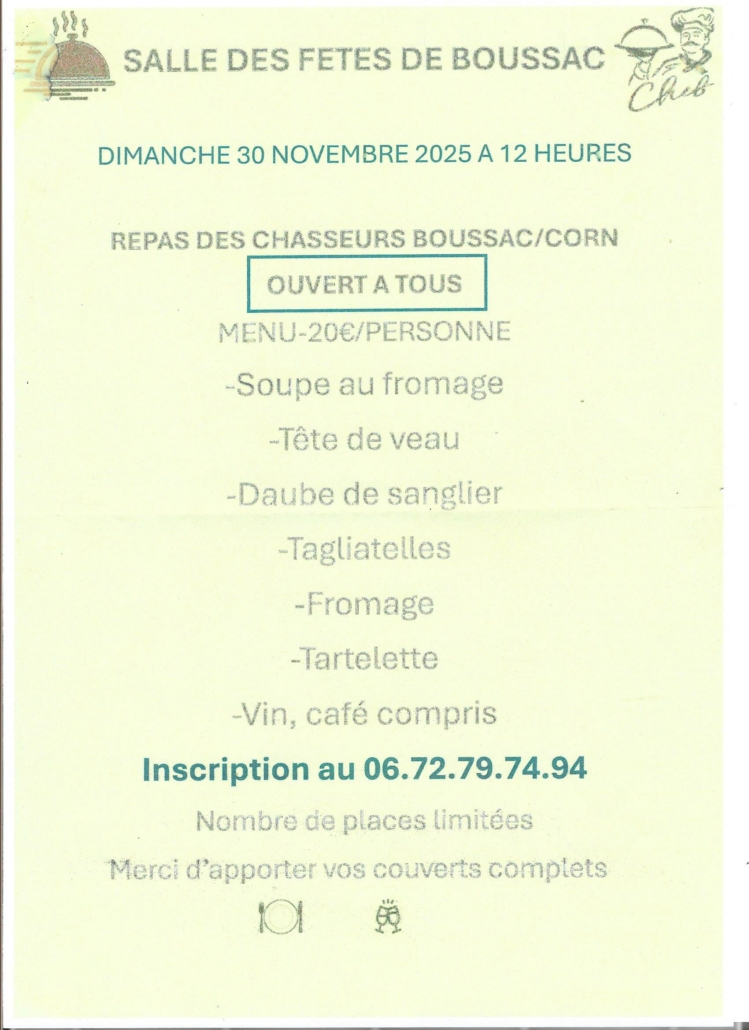 L’association de chasse Boussac-Corn organise son repas de fin d’année ouvert à tous !